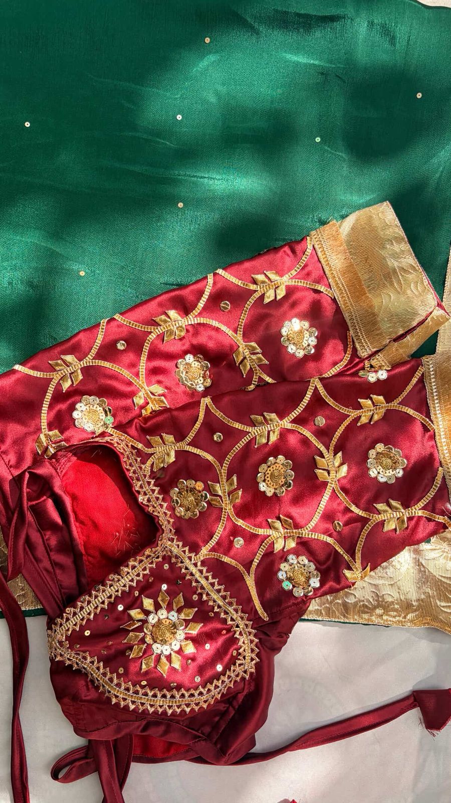 A masterpiece of grace and tradition, this pure tissue silk saree is adorned with exquisite hand embroidery. The richness of its weave and the brilliance of its hues make it a symbol of timeless beauty and devotion. ❤️✨
